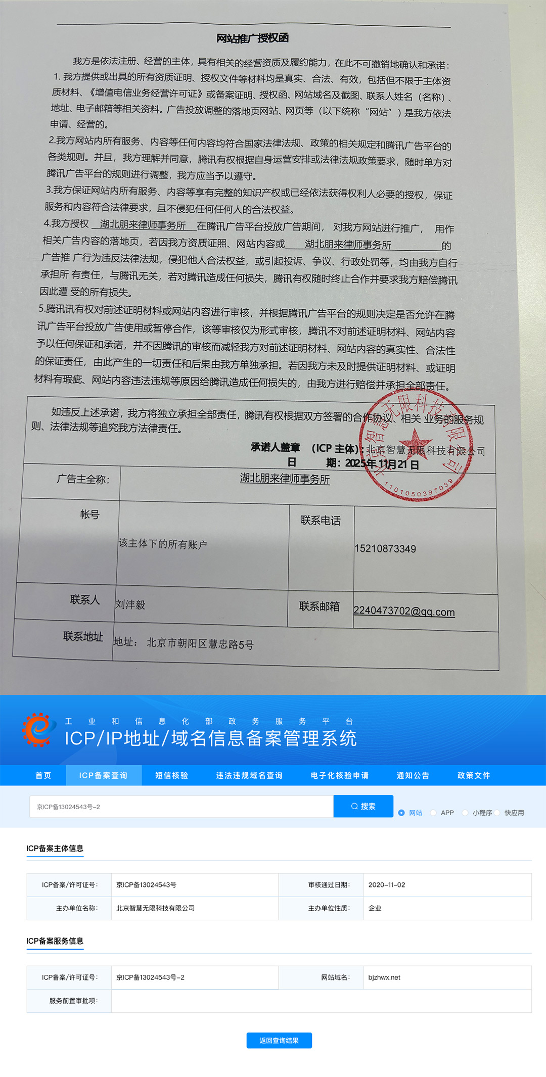 公示湖北朋来律师事务所推广授权与备案材料原件。